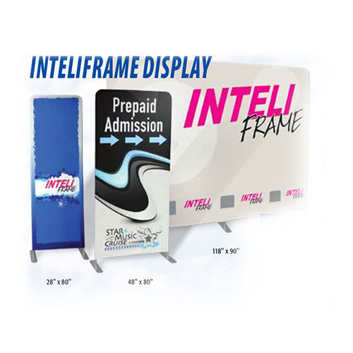 The InteliFrame is a stylish and sophisticated 2-side capable display. Silvertex Display Cloth is custom printed and slips over the frame like a slipcover. TheĀ frame is made of corrosion-resistant aluminum tubing. It assembles easily and is available in three different sizes.