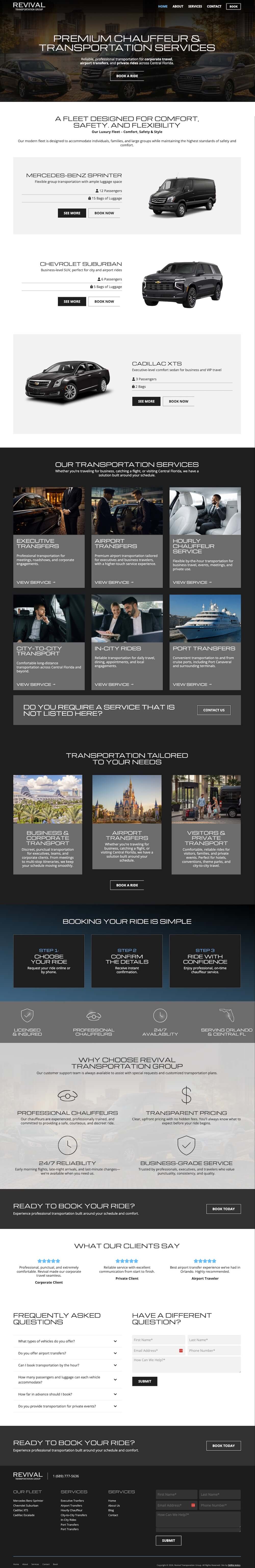 Skillful Antics partnered with Revival Transportation Group to design and launch a modern, conversion-focused website that reflects the brand’s high-end chauffeur and transportation services. The homepage immediately establishes a premium tone through full-width imagery, dark overlays, and refined typography, positioning the company as a luxury provider from the first interaction.