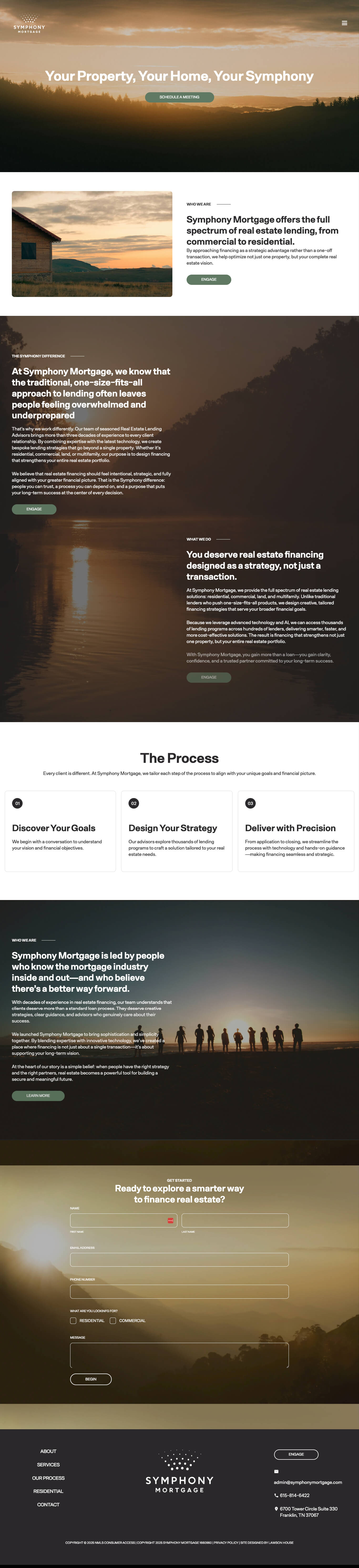 Every section of the page is thoughtfully orchestrated. A cinematic hero image and concise messaging immediately communicate trust and sophistication. Scroll animations and warm, natural imagery guide users through Symphony’s difference, process, and mission — mirroring the calm, confident rhythm of the company’s work. The layout balances professionalism with warmth, using earthy tones and spacious typography to create a refined, trustworthy aesthetic.